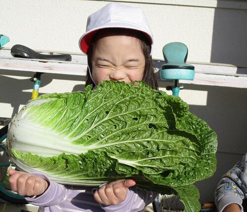今日の2校時に、たんぽぽ学級で育ててきた野菜の収穫を行いました。まず、白菜を収穫しました。珠々七さんの顔よりも、はるかに大きい白菜でした。