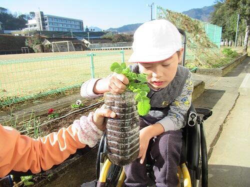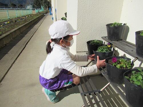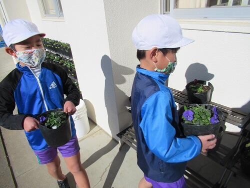 3校時、2年生が冬休みに備えてベランダから職員室前に鉢を移動させました。鉢は、パンジーにビオラ、チューリップなどです。