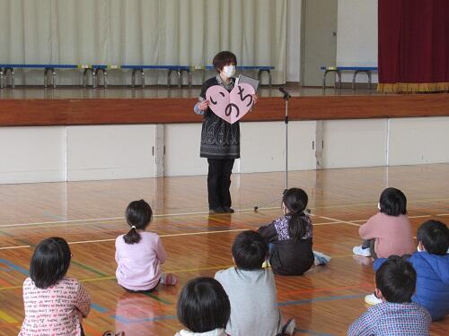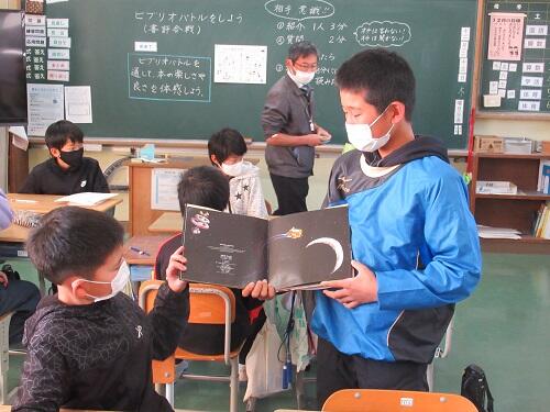 1年の黒木瑛太さんが、音読をがんばって、早口言葉も言えるようになったことを発表しました。発表の中で、「かえるひょこひょこ」「あおまきがみ」を早口で披露してくれました。