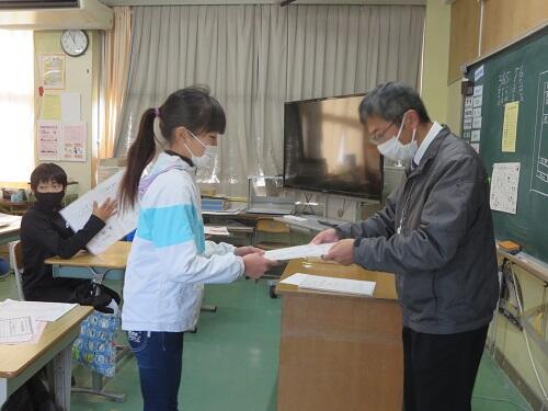 4校時は、各学級で冬休みの課題や冬休みの過ごし方についてのお話がありました。そして、その後「あゆみ」が渡されました。子どもたちも、期待半分、不安半分だったのではないでしょうか。子どもたちには、終業式の際に「1、2、3だけに一喜一憂しないで、先生からのコメントをしっかり読んで、これからに生かしていくように」と話しました。