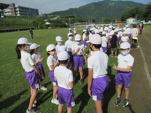 5月27日(金)の朝の時間は、体育タイムでした。まず、縦割り班ごとに整列しました。6年生が、リーダーシップを発揮して素早く整列させてくれました。