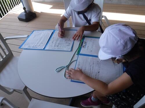 調べて分かったことを、景色のよいテラス席でまとめました。