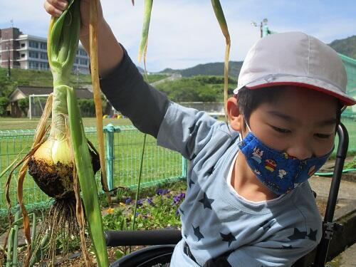 5月27日(金)、たんぽぽ学級は玉ねぎの収穫をしました。力いっぱい引きました。