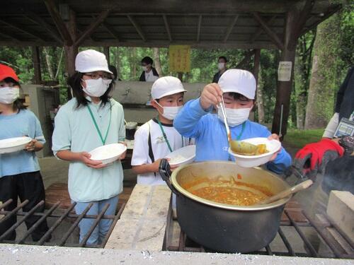 おいしそうなカレーが出来上がりました。順番に後の人のことも考えて、1杯目は少し少なめにつぎました。