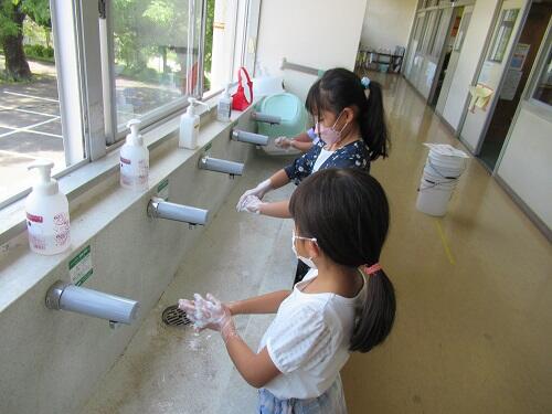 新型コロナウイルス対策として、2学期から2校時終了後、手洗いの曲に合わせて全校一斉に手を洗うことにしました。