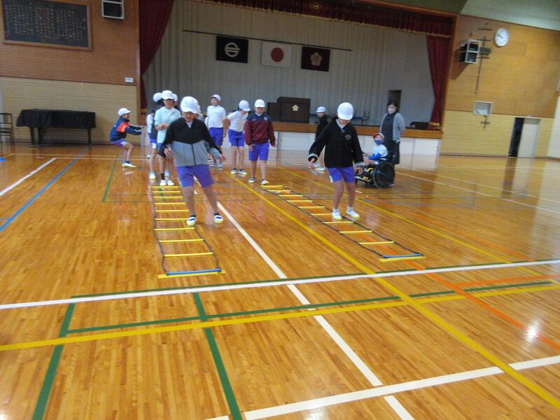 最初は、はしご状のラダーと呼ばれる道具を使い、リズムよく走ったり、細かくステップを踏んで走ったりする練習をしました。