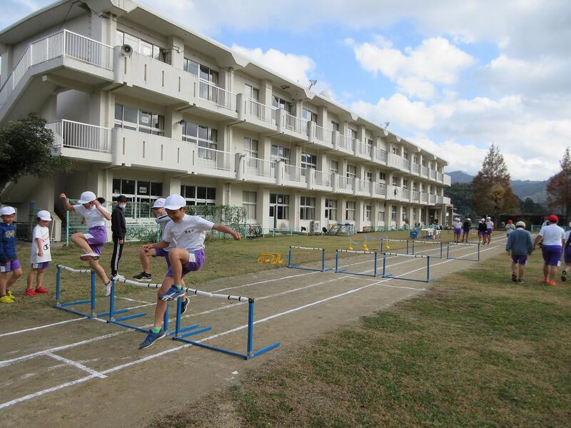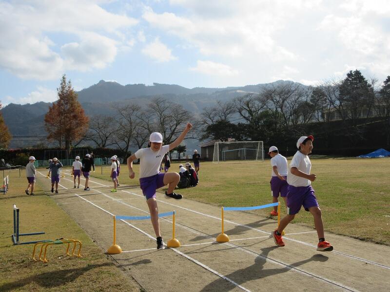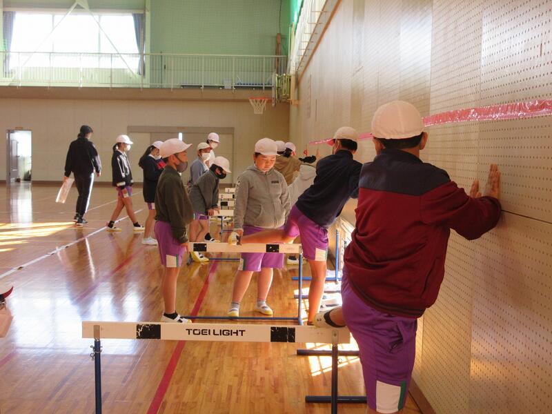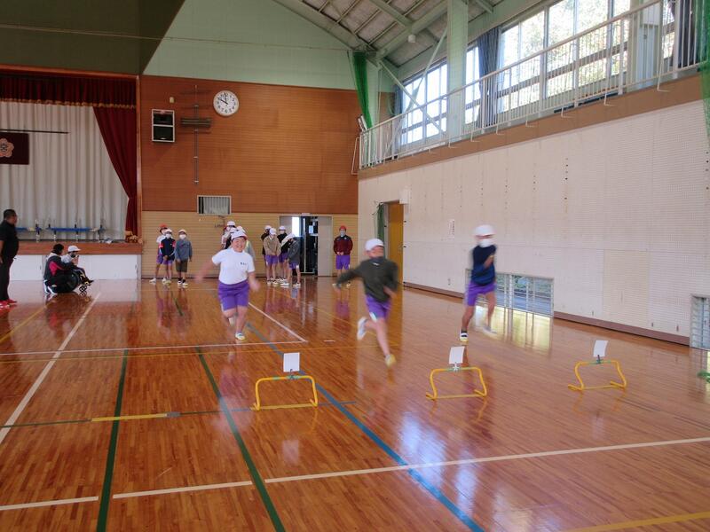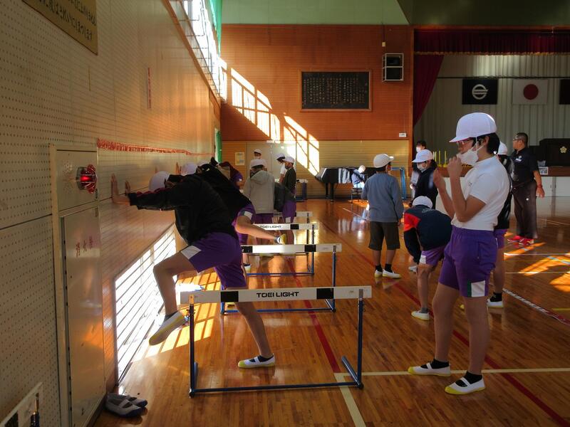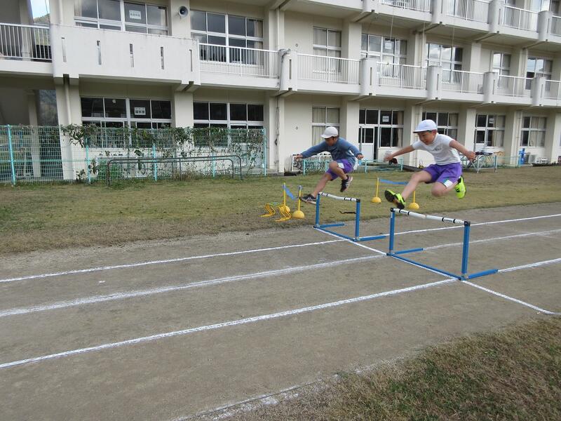 だんだんとリズムよく跳び越し、スピードを落とさずに走ることが出来るようになってきました、明日が富島中学校の先生との最後の授業になりますので、子どもたちも集中して頑張っていました。