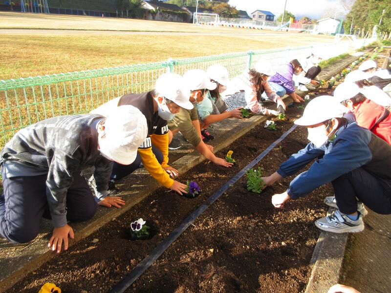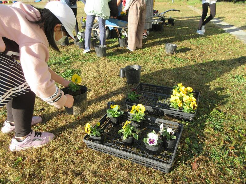 4年生の1人一花はパンジーです。黄色や白、紫などきれいな花が咲いていますが、花がずっと咲き続けるように、咲き終わった花は摘んでいくお世話があります。
