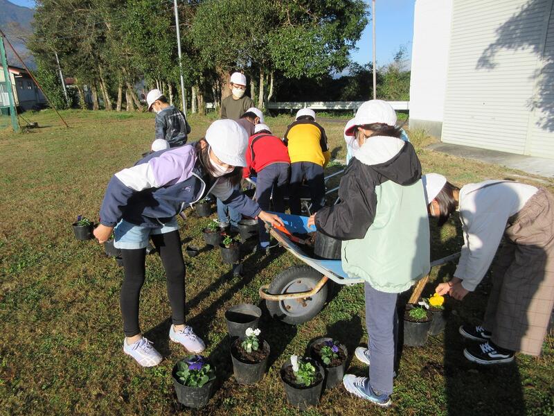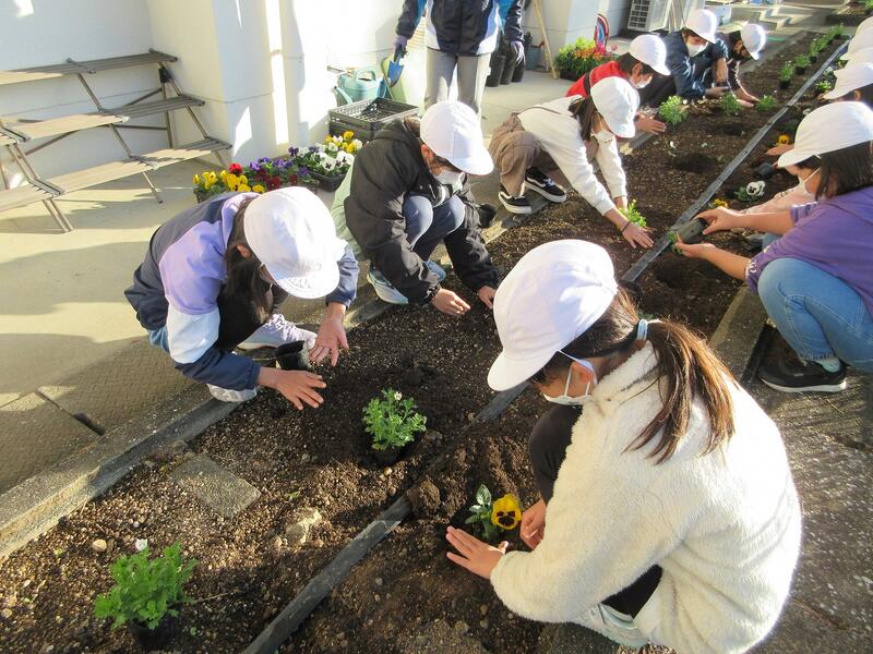 今週から来週にかけて、春に向けての花植えをする花育タイムをしています。今朝は4年生が花壇の花と1人一花の苗を植えていました。