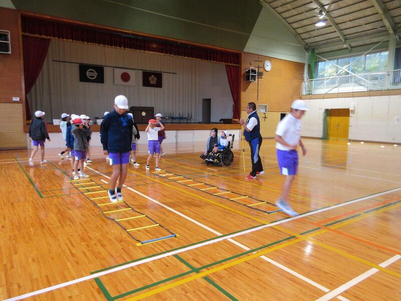 最初は、はしご状のラダーと呼ばれる道具を使い、リズムよく走ったり、細かくステップを踏んで走ったりする練習をしました。