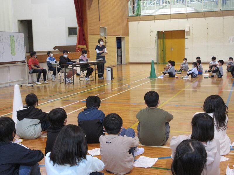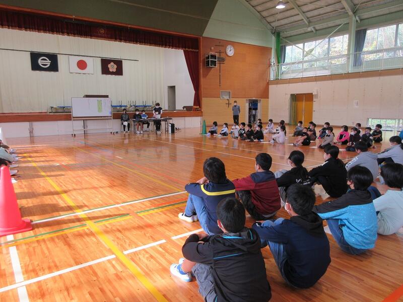 今年初めての取組として、全校児童が集まって「宮水小学校をもっとよくしよう!」というテーマでの児童集会を行いました。