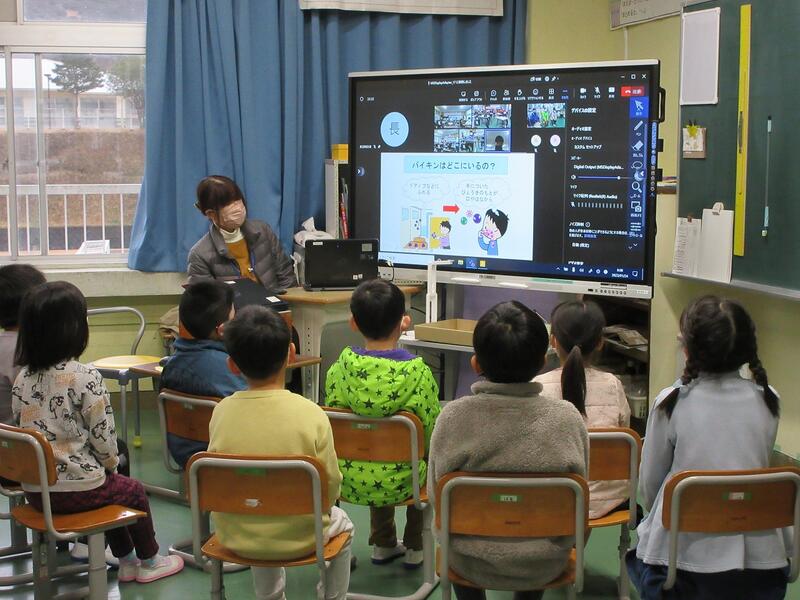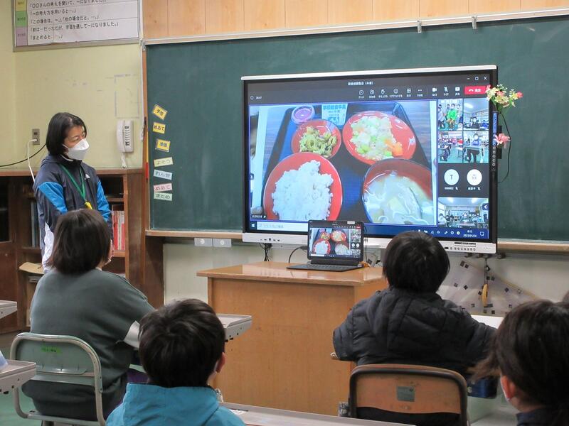 その後、保健給食委員会の児童が、調理員さんにインタビューしたことを発表しました。「食材はどこから来ますか?」「給食は何時から作っていますか?」など、給食ができるまでの苦労や工夫を知ることができました。