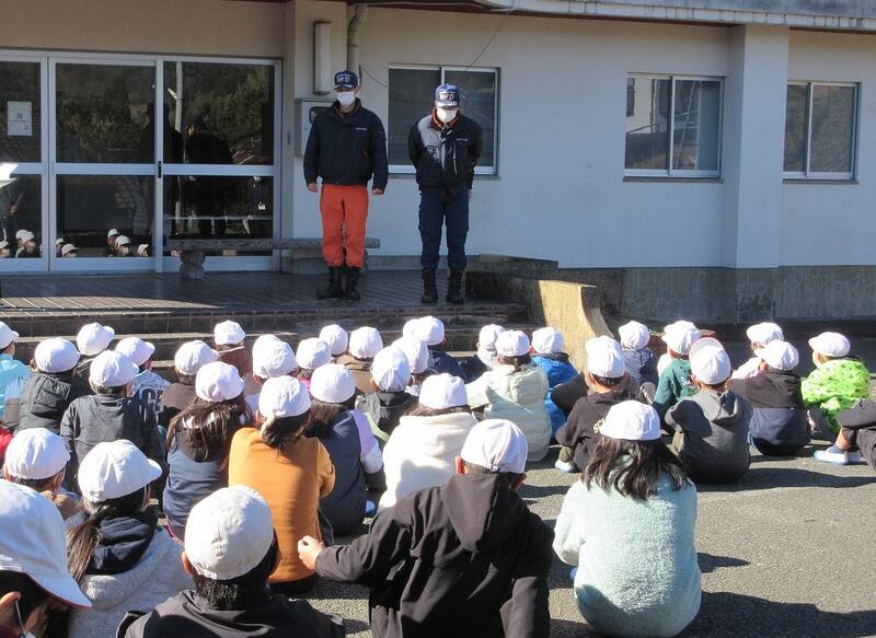 その後、西臼杵広域消防署の甲斐さん(宮水小出身とのことでした)と避難の様子について振り返りをしました。火事を発見した際の初期消火、消防署への連絡、煙を吸わないように避難をすることなど、自分の命を守るための行動を分かりやすく教えていただきました。