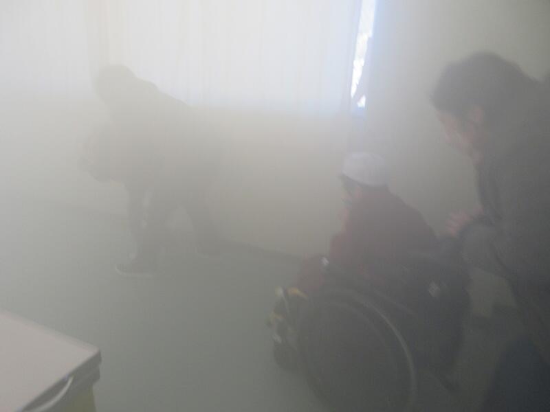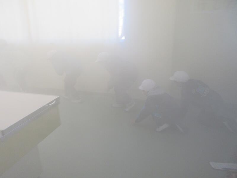 最後に家庭科室を使って、煙のある部屋から避難をするスモーク体験をしました。(人体に安全な煙を使っています。)