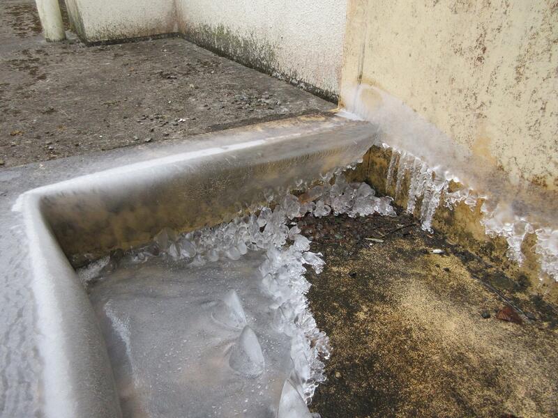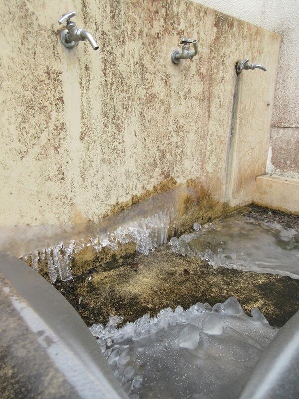 ここ数日、最低気温が零度以下になる寒い日が続いています。気温がマイナス4度以下になると、水道管の破裂などが起こると言われていますので、学校でも凍結防止のために水道から水を少し出していました。すると、次の日には写真のような氷ができていました。