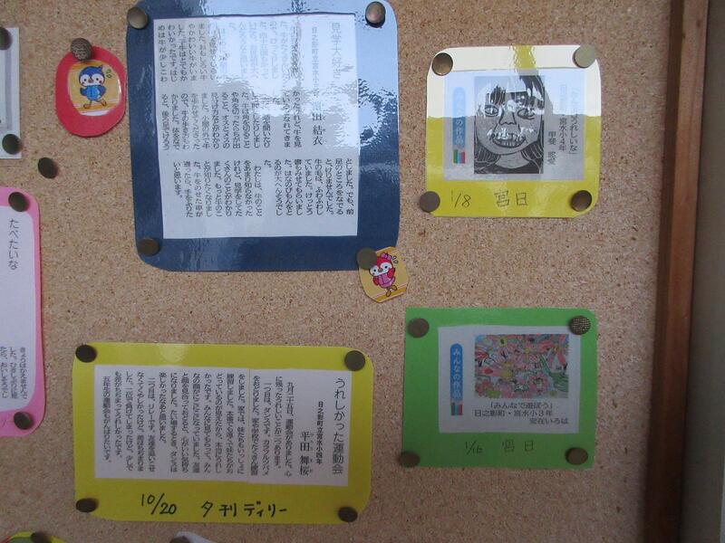 宮水小学校では、作文や絵、習字などの作品を新聞等に投稿し、これまでに掲載された作品を職員室廊下の掲示板に貼っています。