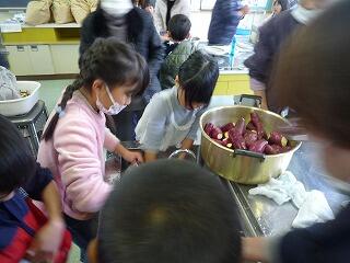 1、2年生は育てた芋を一緒に洗ってふかし芋にしました。その後、折り紙、お手玉、けん玉、毛糸遊び、だるま落とし、竹馬、缶ぽっくり、を一緒にしました。