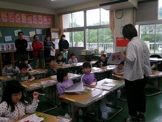 1年生が自己紹介をしていました。大きな声でできました。その後、先生が毎日することの説明をしていました。席についてきちんと聞くことができました。