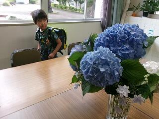 地域の方からあじさいが届きました。とてもきれいで廊下から見えるように校長室に飾っていたら、登校してきた1年生が「きれい」と見に来ました。素敵な出来事でした。地域の皆様、いつもありがとうございます。