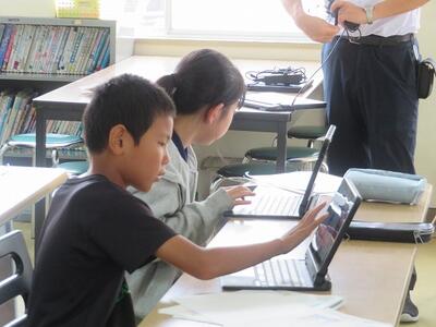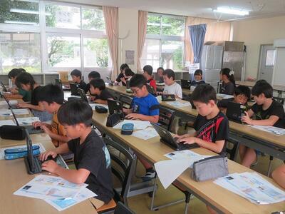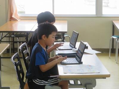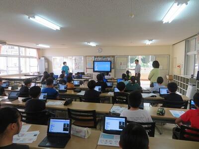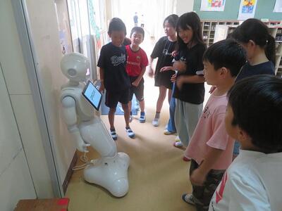 3~6年生を対象にプログラミング教室がランチルームで開かれました。ソフトバンク株式会社様のご協力を得てプログラミングについて学びました。3年生は初めての学習でした。まず初めに、プログラミングの意味や各パーツの意味、組み合わせ方などを詳しく学習しました。その後、それぞれのタブレットを使いながら、プログラミングを行いました。子どもたちは、とても真剣な表情で集中して取り組んでいました。この日の学習の最終の目的は、自分がつくったプログラミングで「ペッパー君」を動かすことです。それぞれの画面の中にいるペッパー君を動かしたり、実際に配置されているペッパー君を動かしたりしました。自分自身が行ったプログラミングでペッパー君が思い通りに動くと、とてもうれしそうでした。今後もプログラミングの学習に取り組みながら、論理的思考力を高めていってほしいと思っています。