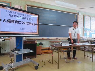 6月24日(火)に本校職員向けの人権教育に関する研修会を実施しました。宮水小学校は、令和7年度の宮崎県指定の人権教育推進校であり、今回の研修は、本校職員の人権教育に関する資質向上が目的です。今回は、宮崎県教育庁人権同和・生徒指導課の高野指導主事を講師としてお招きしての研修でした。人権教育全般について研修しました。その中で、人権問題を直感的に捉える感性や人権への配慮が態度や行動に表れるような感覚を児童に身につけさせることが大切であることを学びました。今回の学びを、日常の指導や道徳、学級活動等の指導に生かしていきたいと思います。