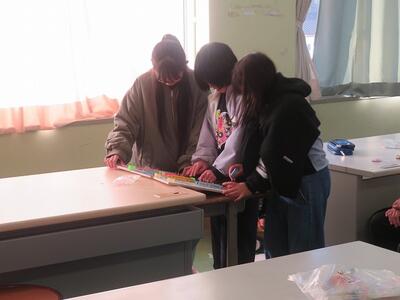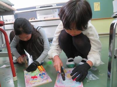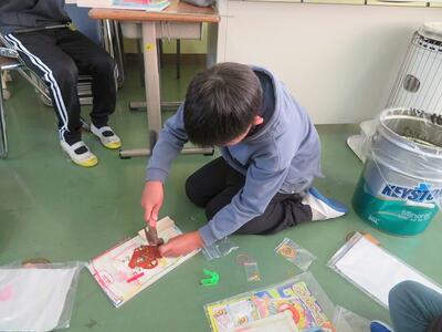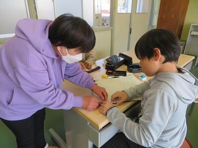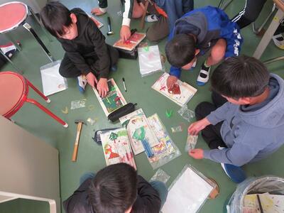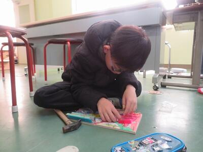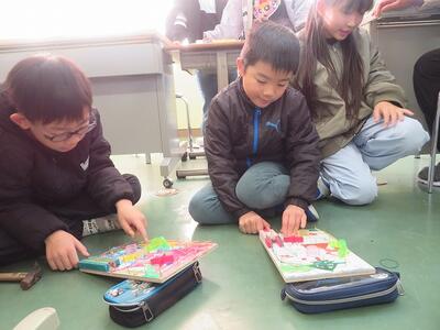 3年生と4年生が図工の時間に釘と金槌を使った作品作りに取り組みました。はじめは普段あまり手にしない部品や道具に苦労して、なかなか進みませんでしたが、釘を打つための補助器具などを用いながら、懸命に作成に励んでいました。ビー玉を使ったゲーム形式の作品であるため、ビー玉の転がり具合を何回も確かめながら完成を目指しました。付属の部品や輪ゴムなどを工夫しながら取り付け、完成した子どもたちもいました。完成した子どもたちは、互いの作品で試しながら、楽しそうに活動していました。
