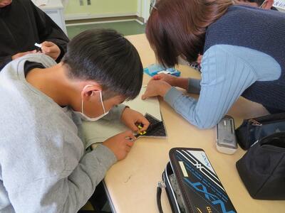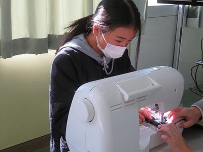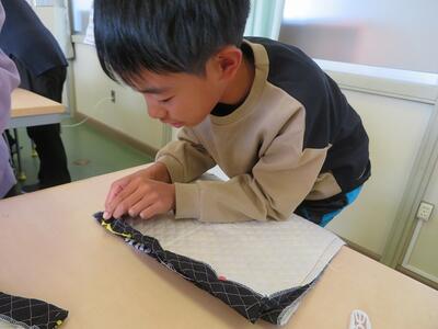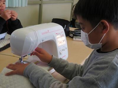 5年生が家庭科の時間に「ナップザック作り」に挑戦しています。今回は、ものを出し入れする部分を縫う作業でした。「布を折り曲げる」「ミシンで縫う部分に印をつける」「まち針で固定する」「仮縫いをする」「ミシンで縫う」という手順です。一つ一つの作業に苦戦していましたが、順調に作業が進んでいきました。完成までには、まだ時間がかかりそうです。完成し、背中に背負うのを楽しみに挑戦し続ける5年生の子どもたちです。