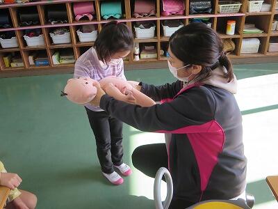 へその緒、胎盤、羊水の役割について勉強した後に赤ちゃん人形を抱っこしました。
