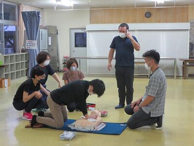 胸骨圧迫の角度やテンポ、手の当て方、AED使用の留意点などを丁寧に教えてくださいました。また、熱中症の症状についても具体的に説明していただきました。