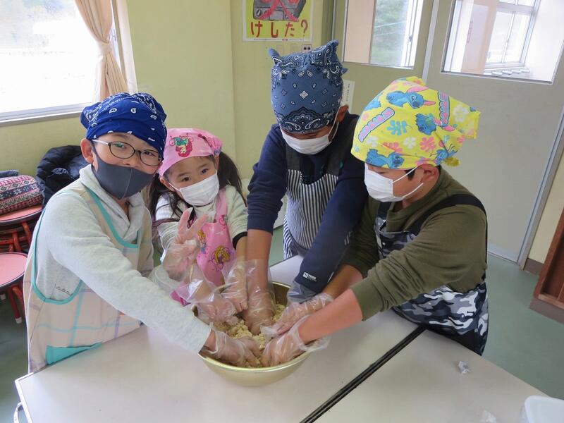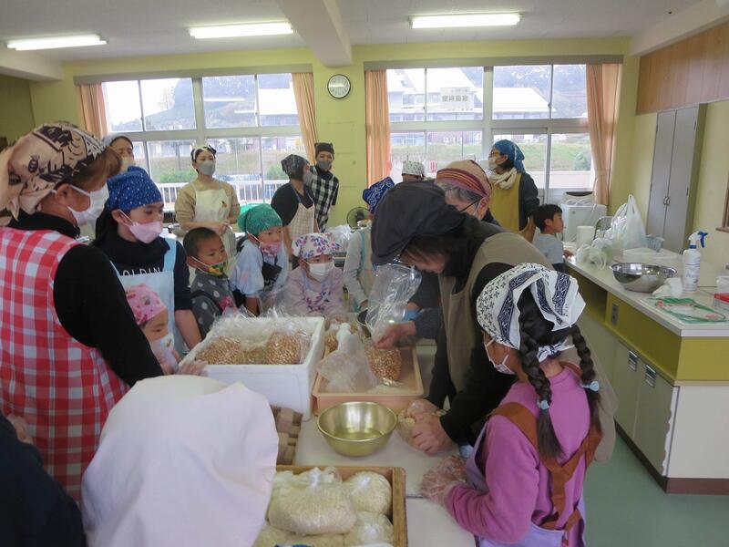 高千穂町「合同会社 あまてらすの娘たち」のお二人を講師にお招きして、味噌づくり体験を行いました。子どもたちも合わせて30名の参加でした。
