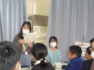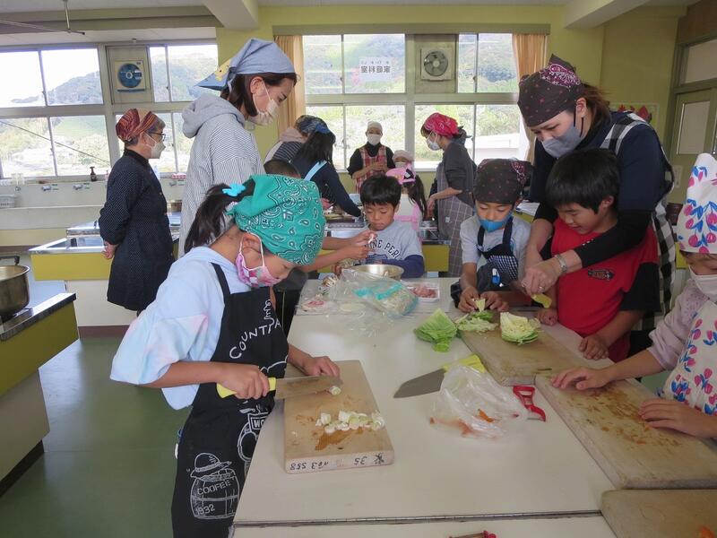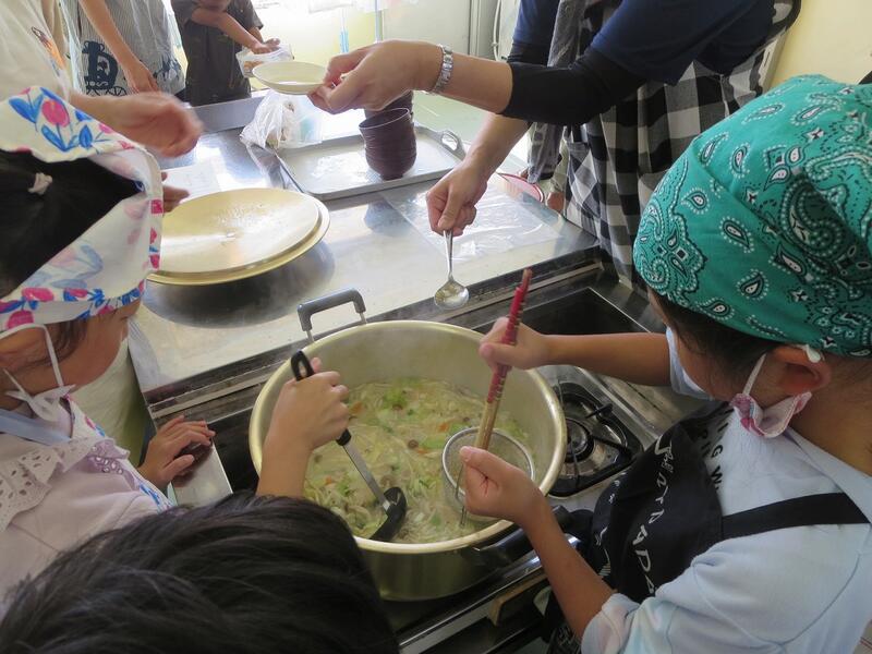 その後、昼食となるワンタンスープづくりをしました。大人に手伝ってもらいながら、自分たちで野菜を切ったり、だしを入れたりする作業を体験しました。