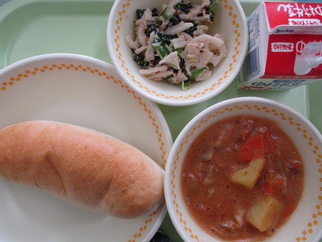 【米粉パン にんじんとごぼうのシチュー しゃきしゃきごまサラダ 牛乳】