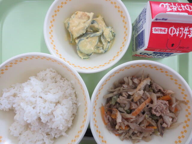 【麦ごはん こんさいのきんぴら かぼちゃサラダ 牛乳】