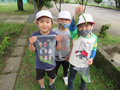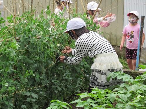おいしそうなスナップエンドウがとれました。「やったー。」