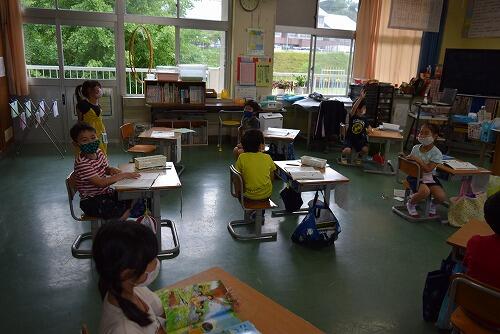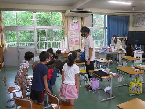 「〇〇さんのとなりの△△さんのとなりの◇◇です。」と同じ班の人の名前も紹介しながら自己紹介をしていました。はじめは人数が少ないですが、最後はたくさんの名前を言います。他の学年のお友達も覚えることができていました。