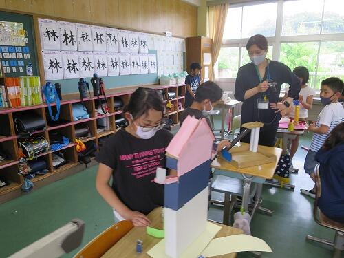 4年生が図工の時間に、ダンボールや画用紙を使って、ビー玉を転がして遊ぶコースをつくっていました。教室に入ると、「見てください」「やってみてください」と自信作を見せてくれました。