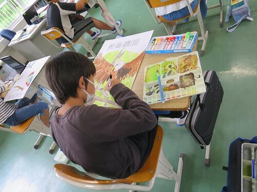 6年生は図工の時間に愛鳥週間のポスターをかいていました。