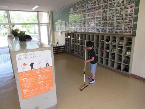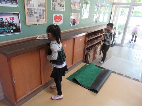 今日から1年生もそうじが始まりました。玄関では、上級生がやさしくそうじの仕方を1年生に教えていました。