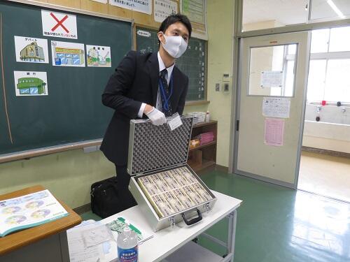 最後に、レプリカの1億円を見せてもらったり、手に持たせてもらったりしました。「意外に重い」とその重さを実感することができました。