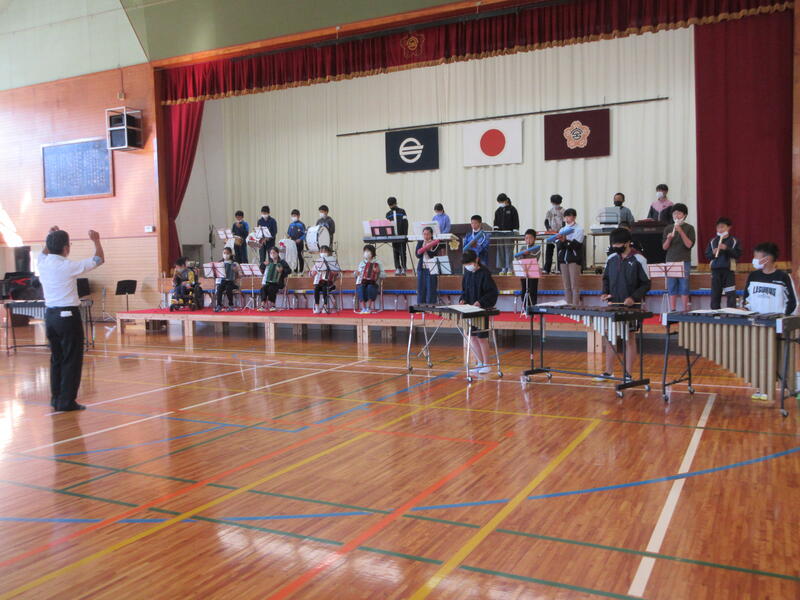 2時間目に音楽祭に向けて全体での練習を行いました。本番と同じようにステージの入場から発表、退場までの練習です。