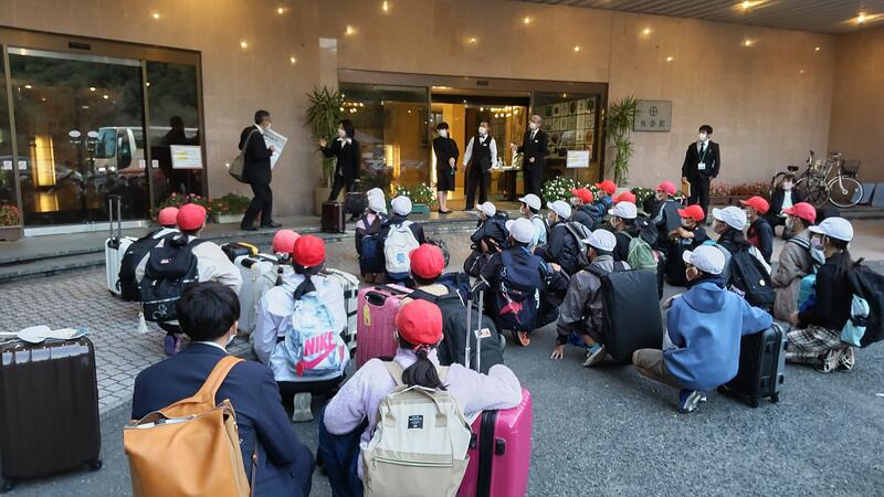 ホテルに到着しました。全員、元気です。この後、部屋に荷物を置いて夕食です。