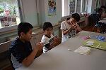 新聞紙と和紙を台形に切り、アルミホイルをはっただるまの型に、紙を交互にはる活動をしました。さすが5・6年生は手慣れたものです。3年生は、上級生に教えてもらいながら活動しました。