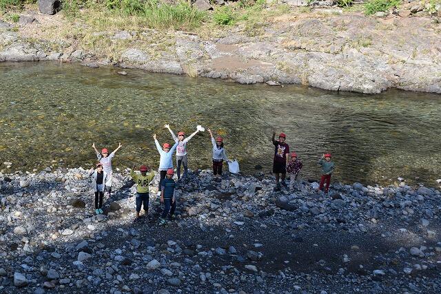 子どもたちは、近くの河原で石集めをしたり、水きりをして遊んだりと