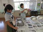 新聞紙と和紙を台形に切り、アルミホイルをはっただるまの型に、紙を交互にはる活動をしました。さすが5・6年生は手慣れたものです。3年生は、上級生に教えてもらいながら活動しました。