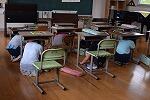 今回は、教室ではなく、図書室や音楽室で地震を起きた時、どのように身を守るかを実践しました。