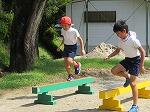 ネットくぐり→ハードル越え(くぐり)→タイヤ引き→平均台わたり→なわとび