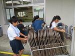 運動会の準備として、長机やパイプ椅子を運んだり、団の看板を装飾したり等しました。