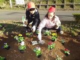 6年生で「ふれあい花壇」の花の植え替えをしました。葉ボタン、パンジー、ビオラの苗を、趣を変えて植えてみました。地域の方々にも喜んでもらえるとうれしいです。