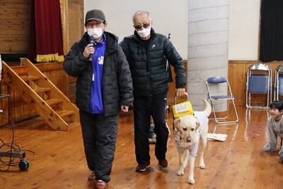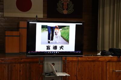 はじめに、盲導犬の育成の様子を紹介するビデオを視聴し、