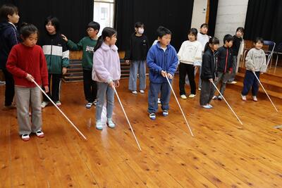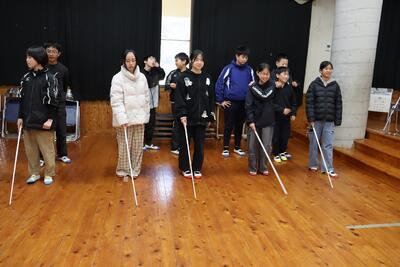 体験活動では、白杖を使って歩く体験を行い、見えにくさを抱える方の